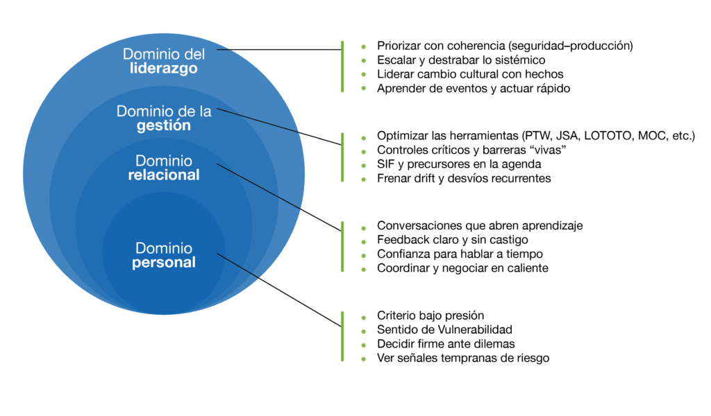 El foco del coaching no está en señalar fallas ni en perseguir incumplimientos. Está en desarrollar líderes capaces de anticipar, tomar decisiones sólidas ante trade-offs seguridad–productividad y actuar sobre las condiciones del sistema que influyen en el desempeño: barreras, recursos, preparación del trabajo, interfaces y aprendizaje.